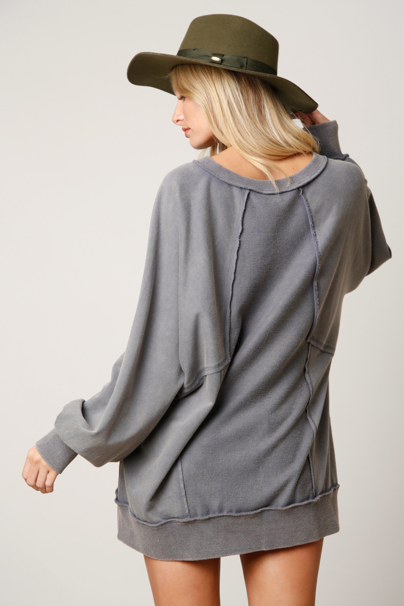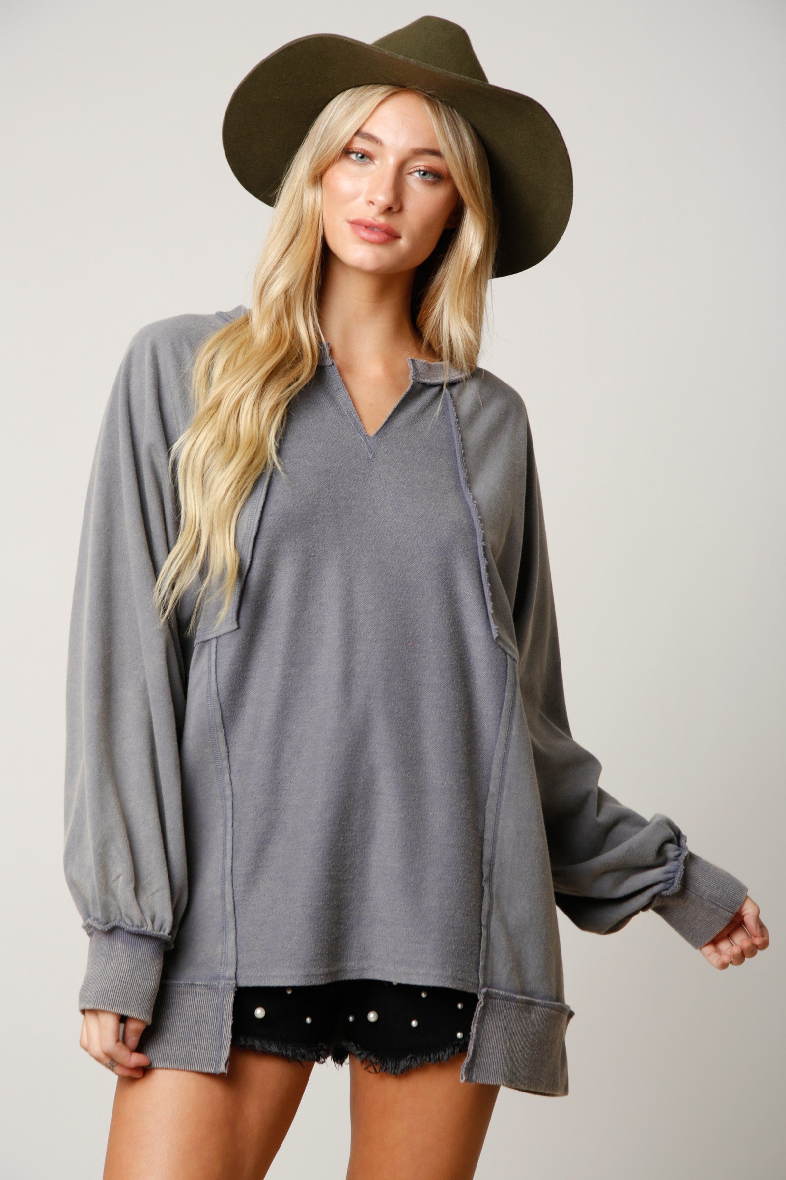 This Closet Staple Sweatshirt is an oversized and edgy must-have! With its washed fabric and raw edge detail around the notch neckline, you'll look smart and sporty no matter the occasion! Make this closet staple your go-to look for a fashionably-casual style.