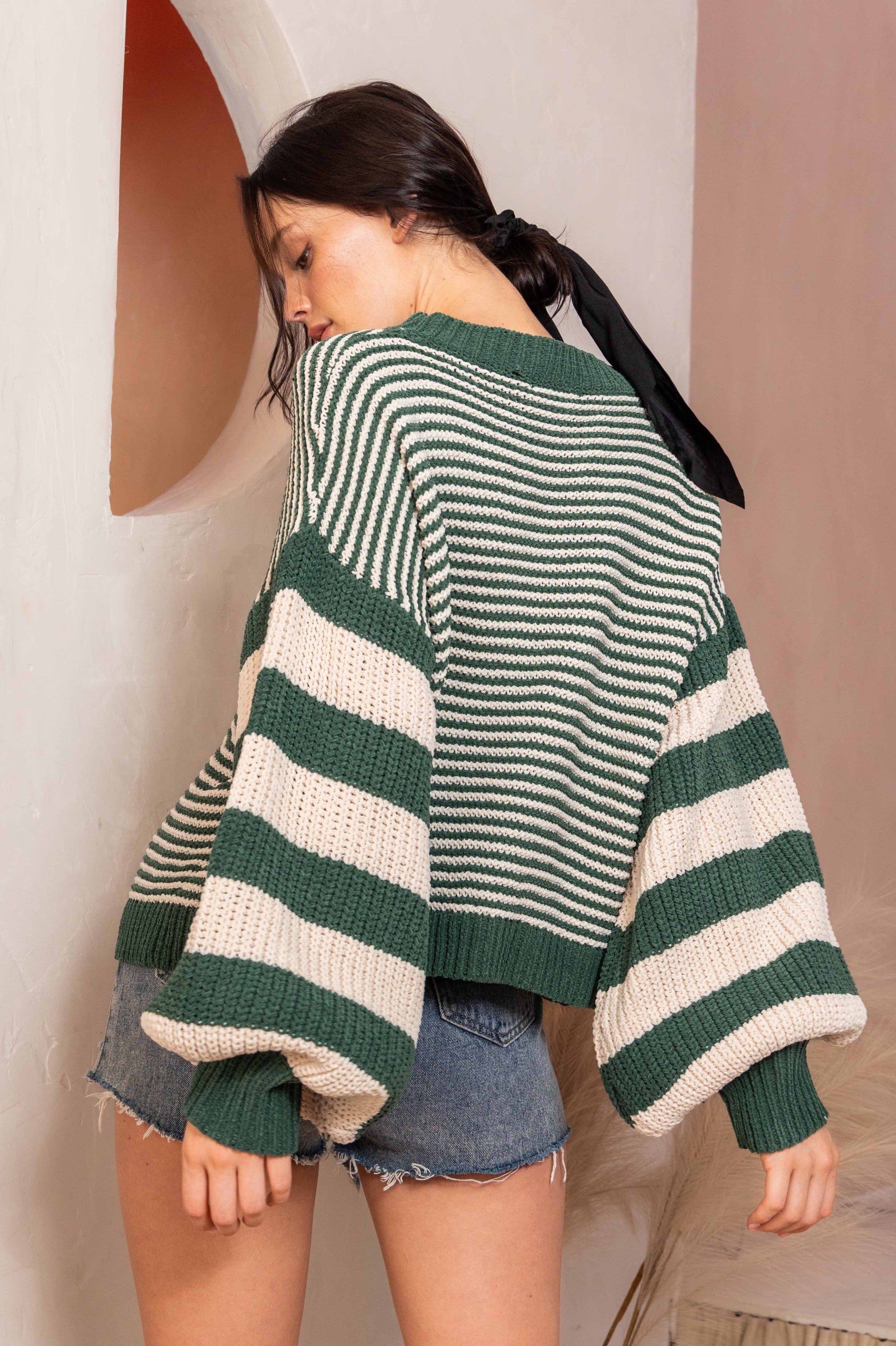 Stay warm and stylish in the Marie Sweater. Crafted from a knit fabric with striped detail, the sweater features balloon sleeves and a rounded ribbed neckline, providing both comfort and style.