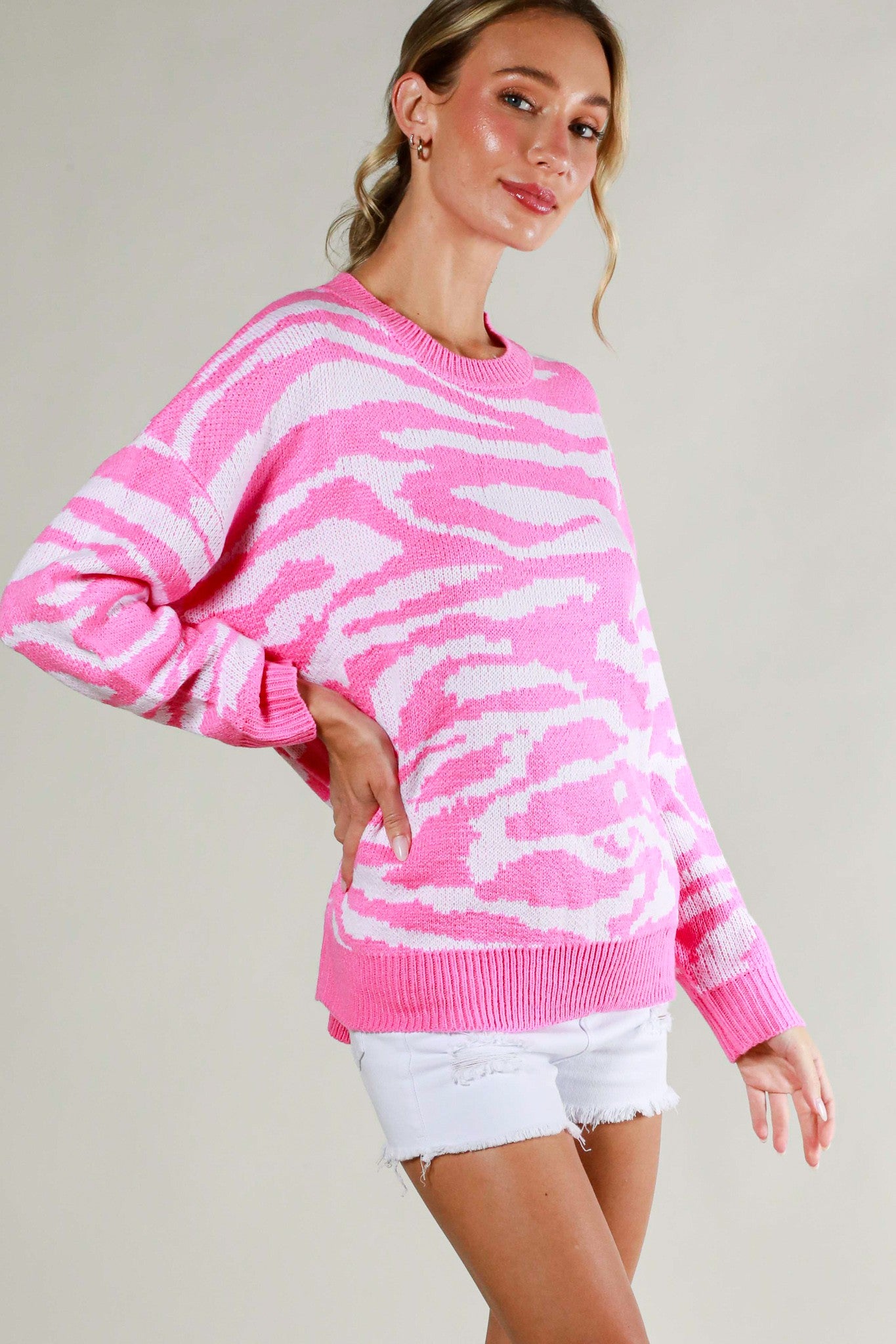 Make a statement in the Wild Side Sweater. This printed top features a round neck with a fun zebra pattern, complete with the perfect shade of pink. Make a bold style statement that's sure to turn heads.