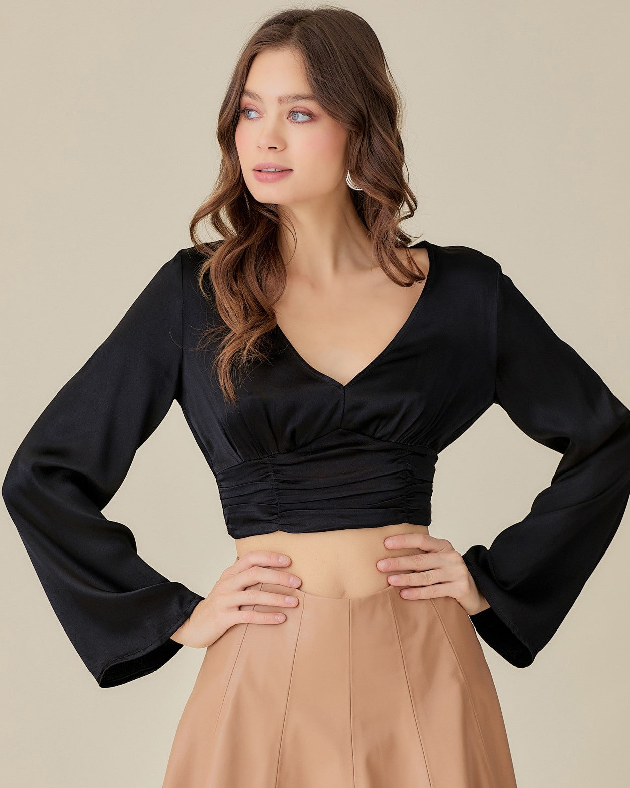 • Why we LOVE it: deep v neckline, ruched waist, bell sleeves, cropped length, beautiful satin feel material that gives it such an upscale look, can be worn with jeans for a night out or dressed up with black leather pants or skirt
