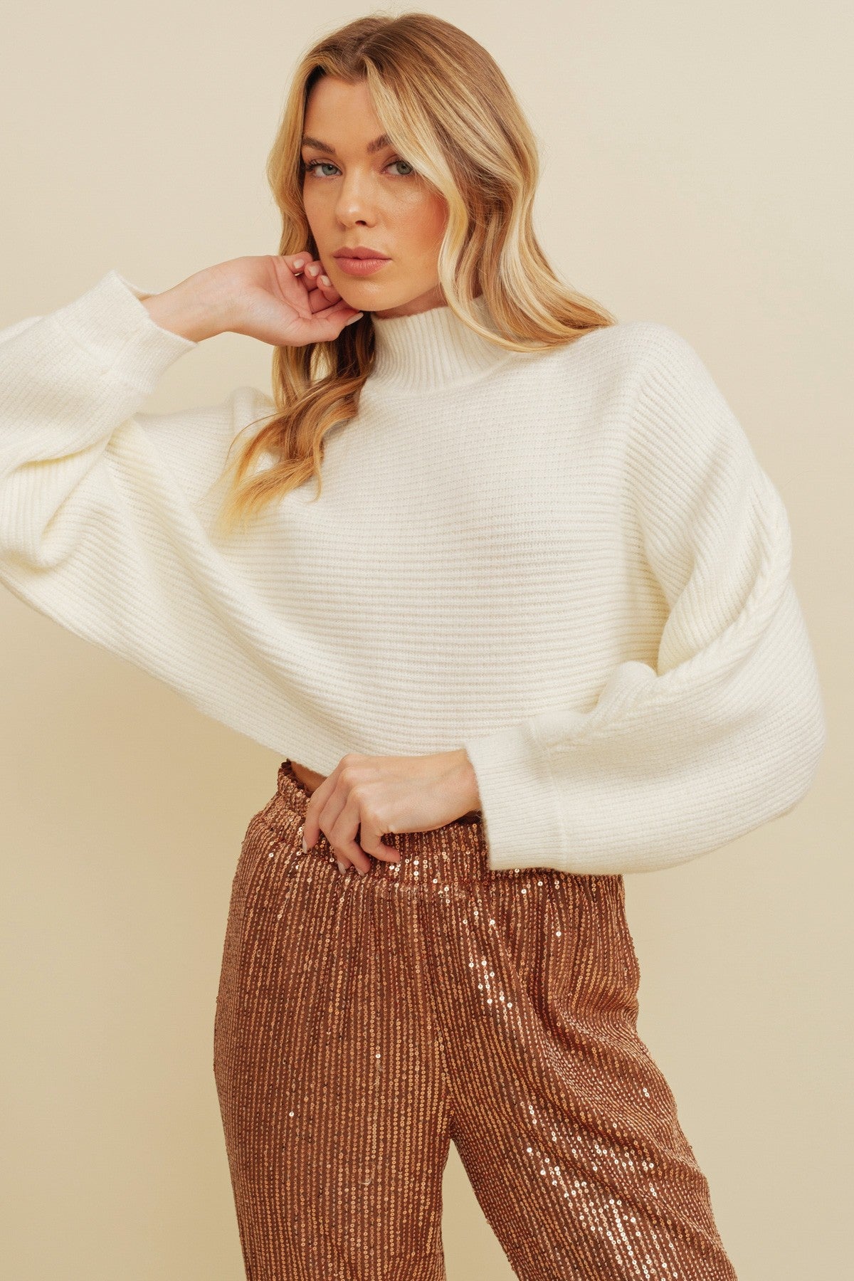 Stay warm and cozy this winter in our Wonderland Sweater. Crafted from soft winter white fabric, this cropped turtleneck sweater is a plush and stylish addition to any wardrobe.